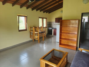 – 2 Betten, Couch, Couchtisch, Esstisch mit Stühlen, Kühlschrank und einem Herd mit Gasflasche.